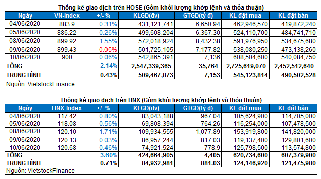 - Các chỉ số thị trường biến động tích cực trong phiên ngày 10/06/2020. Cụ thể, chỉ số VN-Index tăng nhẹ 0.06%, đạt 900 điểm; HNX-Index tăng 0.46%, đạt mức 120.68 điểm.