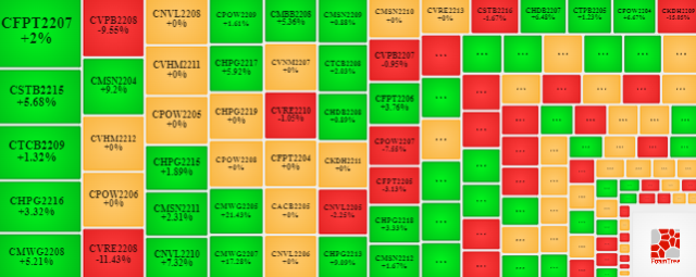 Khối lượng giao dịch toàn thị trường trong phiên hôm nay đạt 20 triệu đơn vị, giảm 40.09%; giá trị giao dịch đạt 11 tỷ đồng, giảm 28.21% so với phiên 19/09/2022. Trong đó, CMSN2202 là mã dẫn đầu thị trường về khối lượng, CMBB2208 dẫn đầu về giá trị giao dịch.
