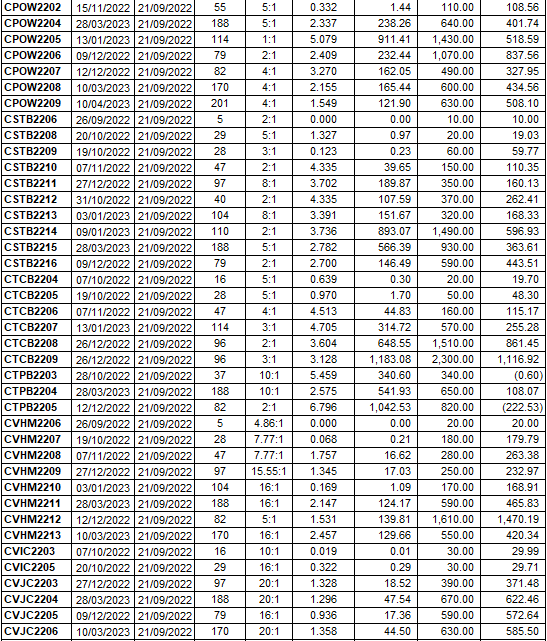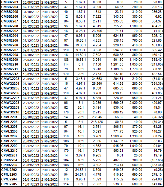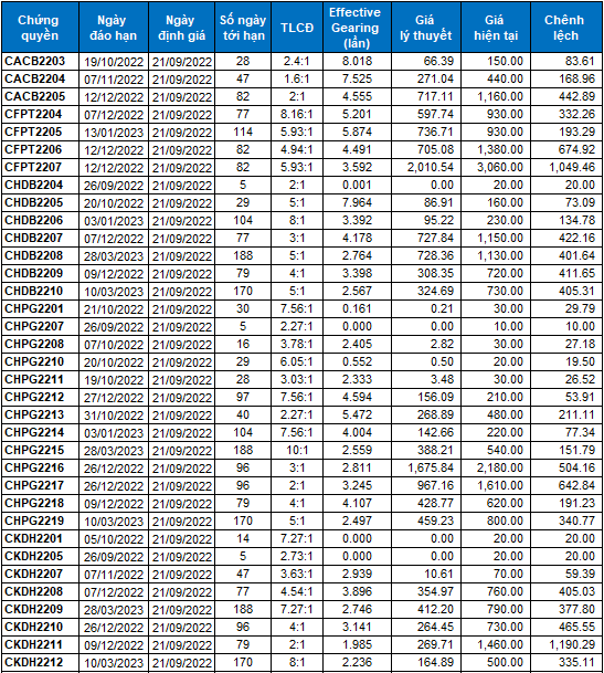 Dựa trên phương pháp định giá phù hợp với thời điểm khởi đầu là ngày 21/09/2022, mức giá hợp lý của các chứng quyền đang được giao dịch trên thị trường được thể hiện như sau:
