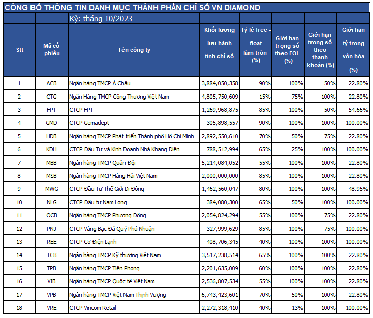 Theo lần cập nhật vào ngày 17/10, Sở Giao dịch Chứng khoán TP HCM (HOSE) quyết định thêm HDB và VRE vào chỉ số VN Diamond, trong khi chỉ loại DHC. Tổng số cổ phiếu tăng lên 18 mã. Danh mục mới có hiệu lực từ ngày 06/11.