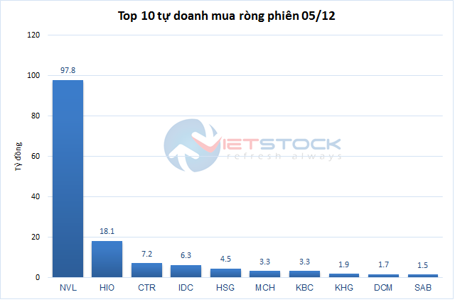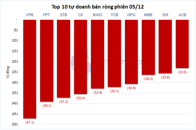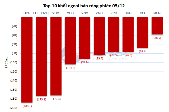 Phiên giao dịch ngày 05/12, tự doanh công ty chứng khoán và khối ngoại đều bán ròng, lần lượt 425 tỷ đồng và 1,609 tỷ đồng.