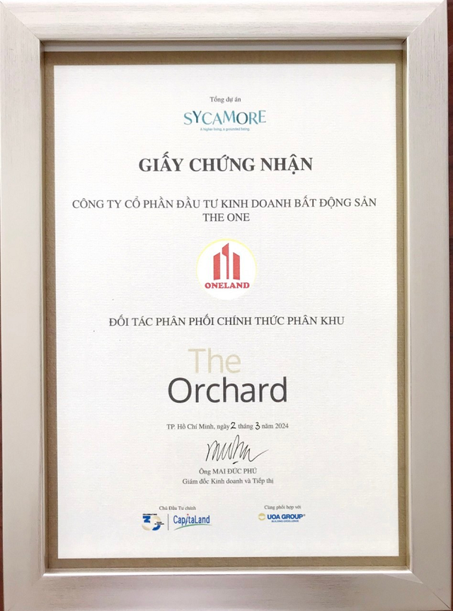Công ty Cổ phần Đầu tư Kinh doanh Bất động sản The One Land - Đại lý phân phối chính thức phân khu The Orchard – Sycamore Bình Dương.