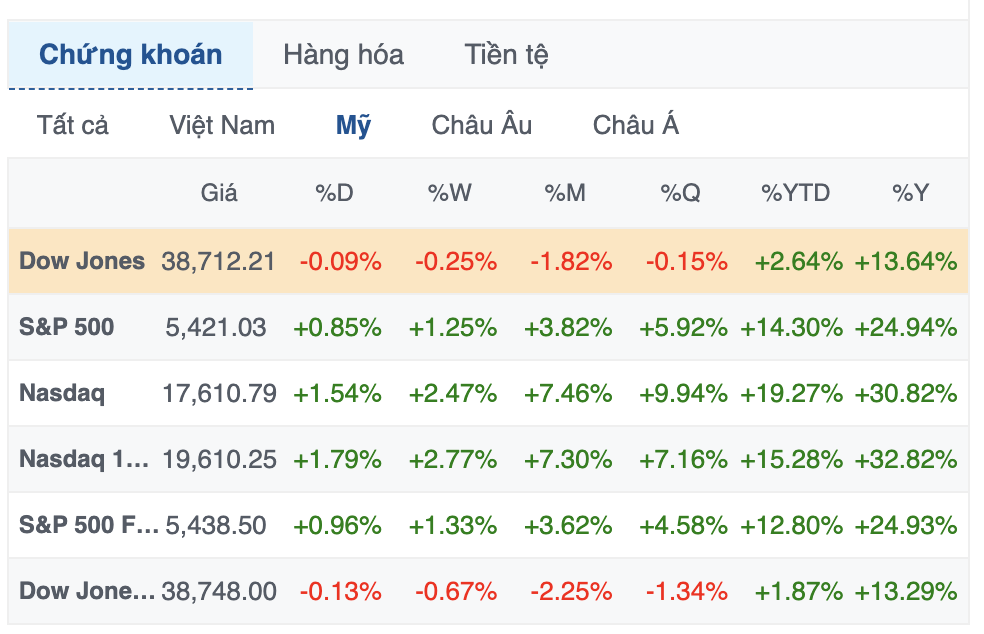 Kết thúc phiên giao dịch ngày 12/06, chỉ số S&P 500 tiến 0.85% lên 5,421.03 điểm, còn chỉ số Nasdaq Composite cộng 1.53% lên 17,608.44 điểm. Cả S&P 500 và Nasdaq Composite đều đạt mức cao mọi thời đại và đóng cửa ở mức cao kỷ lục vào ngày thứ Tư. Trong khi, chỉ số Dow Jones lùi 35.21 điểm (tương đương 0.09%) xuống 38,712.21 điểm.