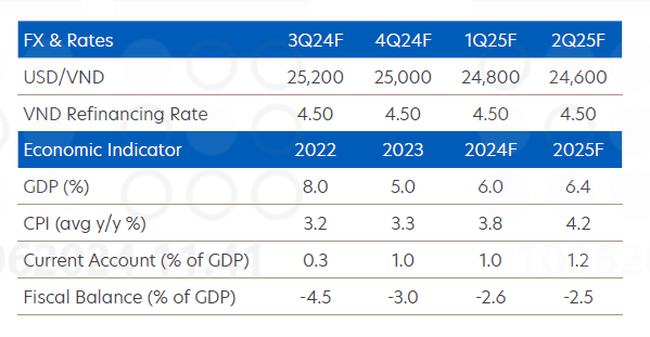 Trong khi những rủi ro bên ngoài tiếp tục đè nặng lên triển vọng kinh tế (bao gồm xung đột ở Đông Âu và Trung Đông), triển vọng của Việt Nam được củng cố nhờ sự phục hồi của nhu cầu chip bán dẫn, tăng trưởng ổn định ở Trung Quốc và khu vực, cũng như những sự dịch chuyển trong chuỗi cung ứng đang diễn ra. Dựa trên dữ liệu được công bố cho đến nay, UOB kỳ vọng tăng trưởng GDP sẽ tăng lên 6% so với cùng kỳ trong quý 2/2024, kéo dài mức tăng 5.66% trong quý 1/2024. UOB duy trì dự báo tăng trưởng của Việt Nam ở mức 6% cho năm 2024 (mục tiêu chính thức: 6.0-6.5%).
