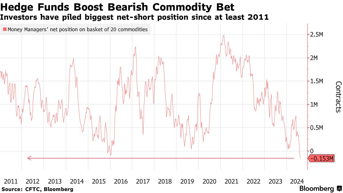 Theo số liệu từ Ủy ban Giao dịch Hàng hóa Tương lai Mỹ (CFTC), các nhà quản lý quỹ đã tích lũy vị thế ròng bán khống gần 153,000 hợp đồng tương lai và quyền chọn trên 20 thị trường nguyên liệu thô trong tuần vừa qua. Đây là mức cao nhất kể từ khi Bloomberg bắt đầu theo dõi dữ liệu vào năm 2011, phản ánh một bức tranh ảm đạm chưa từng thấy về triển vọng của thị trường hàng hóa.
