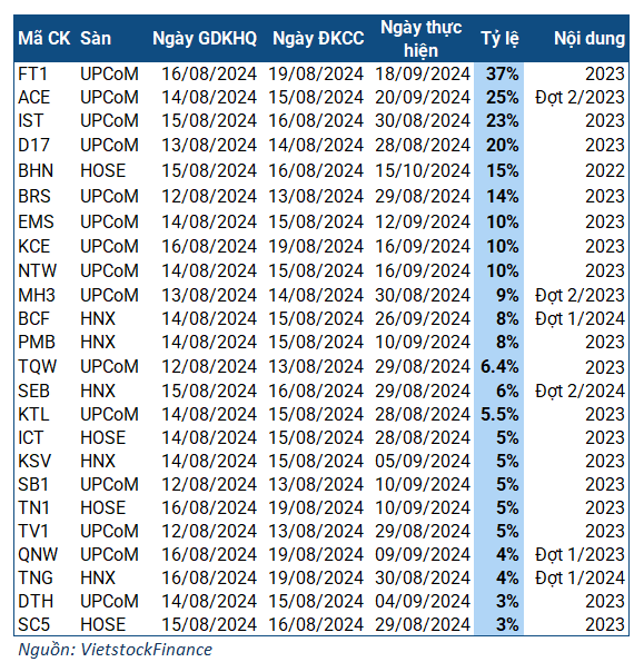 Ngày giao dịch không hưởng quyền là 16/08, thanh toán vào 18/09/2024.