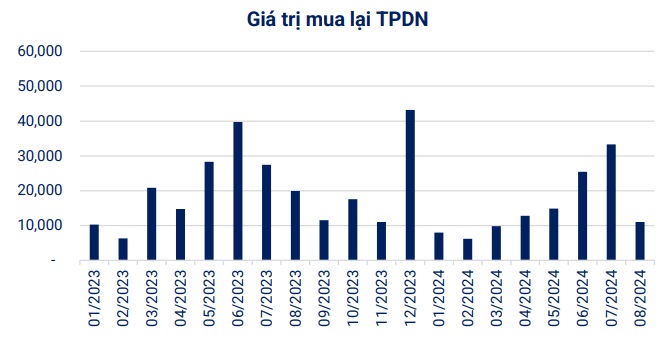 Trong tháng 8, các doanh nghiệp đã mua lại 11,023 tỷ đồng trái phiếu trước hạn, giảm 45% so với cùng kỳ 2023. Trong phần còn lại của năm 2024, ước tính sẽ có khoảng 106 ngàn tỷ đồng trái phiếu đáo hạn. Phần lớn trong đó là trái phiếu bất động sản, với gần 43.4 ngàn tỷ đồng, chiếm 40.9% tổng giá.