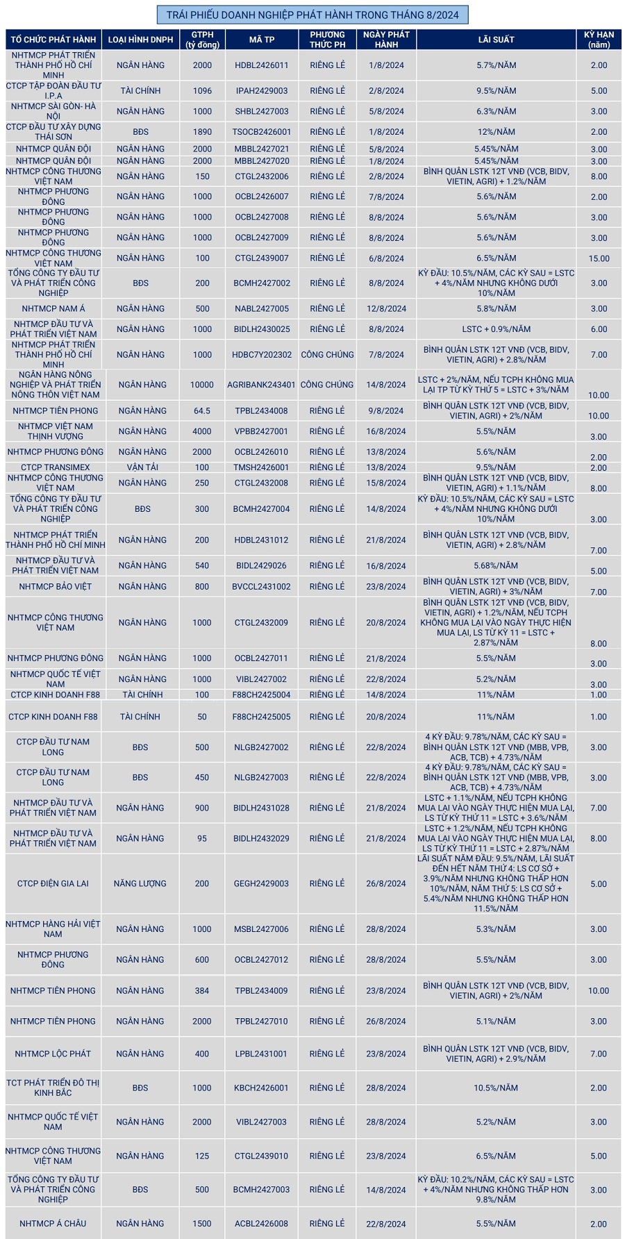 Dữ liệu do Hiệp hội Thị trường Trái phiếu Việt Nam (VBMA) tổng hợp từ HNX và SSC, tính đến ngày 30/08/2024, có 43 đợt phát hành trái phiếu doanh nghiệp (TPDN) riêng lẻ trị giá 37,995 tỷ đồng, và 2 đợt phát hành ra công chúng trị giá 11,000 tỷ đồng trong tháng 8/2024.