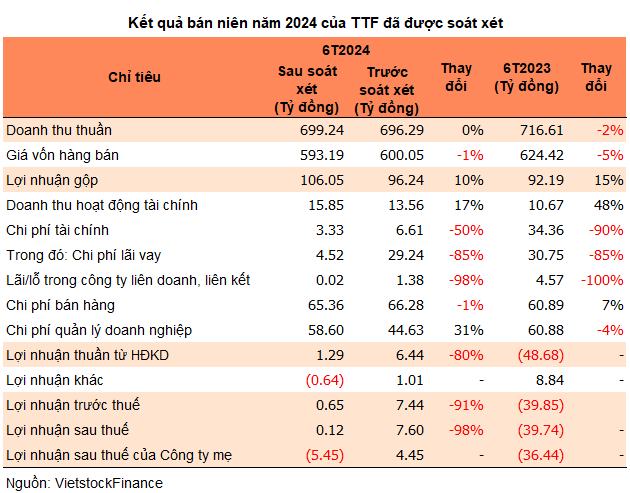 Đây không phải lần đầu tiên, lợi nhuận của TTF trồi sụt mạnh so với báo cáo tự lập. Gần nhất, sau kiểm toán năm 2023, Công ty lỗ ròng tới 134 tỷ đồng, trong khi báo cáo tự lập lãi 11 tỷ đồng, do có thêm chi phí phạt thuế cộng với lỗ từ xóa sổ và thanh lý tài khoản.