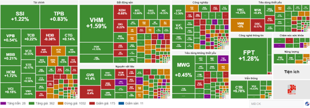 So với đầu phiên, bên mua vẫn có phần chiếm ưu thế hơn. Số mã tăng là 362 mã và số mã giảm là 173 mã.