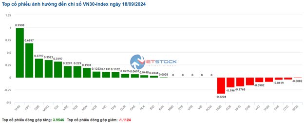 | Top 10 cổ phiếu tác động tới VN-Index phiên 18/09/2024 (tính theo điểm) | ||