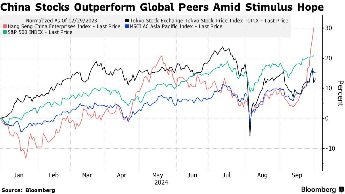 Thị trường ở Trung Quốc đại lục tạm ngưng giao dịch trong tuần này do kỳ nghỉ Tuần lễ Vàng. Trước đó, chứng khoán Trung Quốc ghi nhận phiên tăng mạnh nhất trong 16 năm vào ngày 30/09, với mức tăng hơn 8%. Đây là kết quả sau khi Bắc Kinh công bố một loạt biện pháp kích thích vào tuần trước, bao gồm cắt giảm lãi suất, giảm yêu cầu dự trữ cho các ngân hàng và cung cấp nhiều thanh khoản hơn cho các nhà đầu tư.