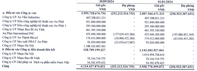 Theo BCTC riêng, AAA dự phòng thêm 16 tỷ đồng khoản đầu tư vào công ty con An Phat International Inc, làm lũy kế trích lập đến cuối quý 3 khoảng 178 tỷ đồng, trên tổng số tiền bỏ ra 455 tỷ đồng. Tương tự, Công ty trích lập thêm gần 22 tỷ đồng đối với công ty con Sản xuất PBAT An Phát, nâng số dự phòng lên gần 24 tỷ đồng, bằng khoảng 25% vốn gốc ban đầu.