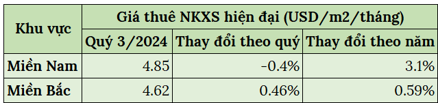 Tại miền Nam, giá chào thuê trung bình của nhà kho xây sẵn hiện đại là 4.85 USD/m2/tháng, tăng 3% so cùng kỳ.