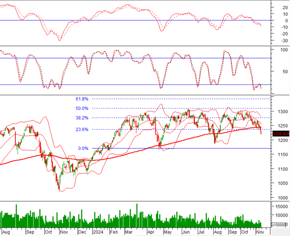 Hiện tại, VN-Index thất bại trong việc test lại ngưỡng Fibonacci Projection 23.6% (tương đương vùng 1,225-1,240 điểm) trong bối cảnh chỉ báo MACD đang không ngừng mở rộng khoảng cách với đường Signal sau khi cho tín hiệu bán trước đó cho thấy xu hướng điều chỉnh ngắn hạn khả năng cao có thể tiếp diễn trong các phiên tới.