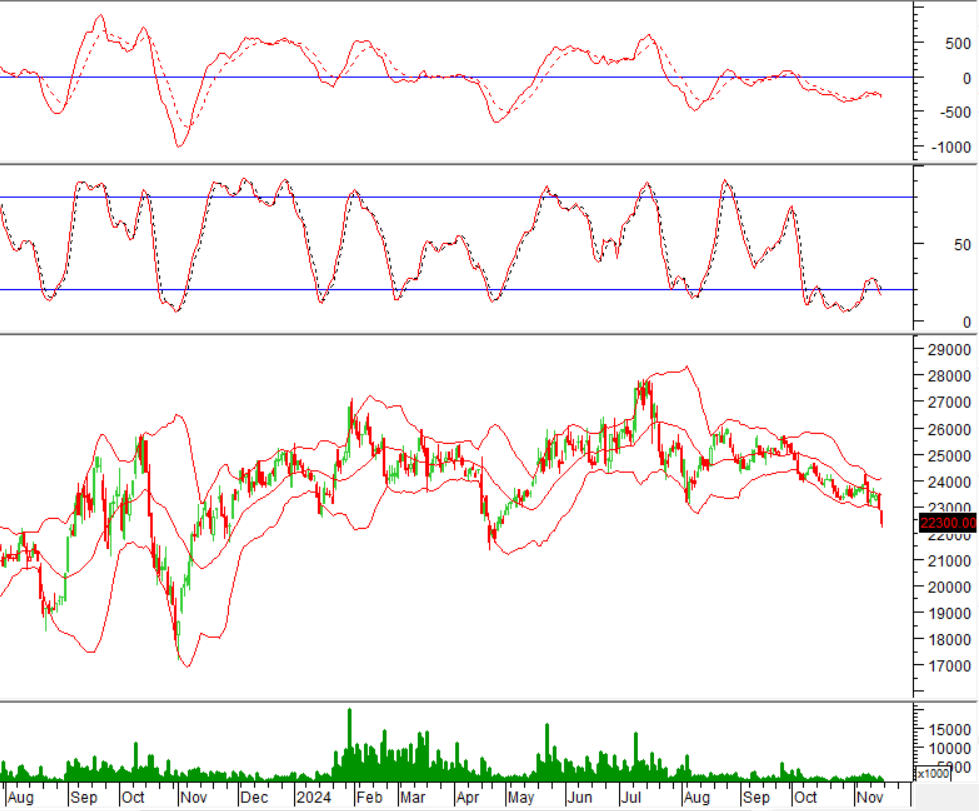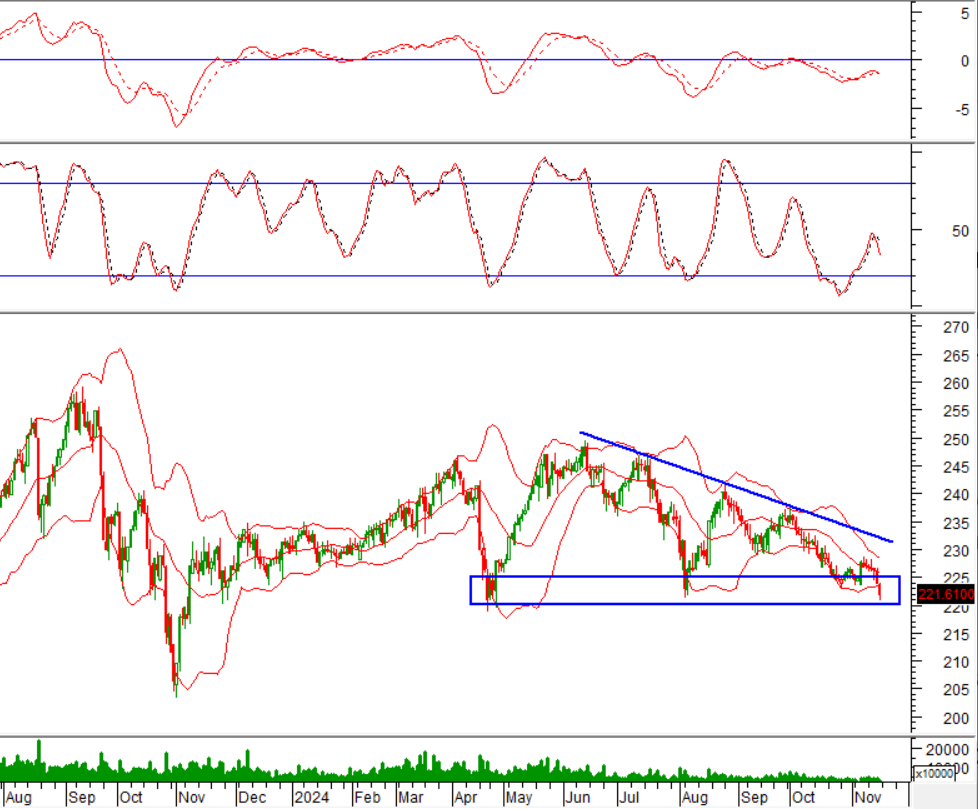 Bên cạnh đó, HNX-Index đang test lại đáy cũ tháng 4/2024 (tương đương vùng 220-225 điểm) trong bối cảnh chỉ báo Stochastic Oscillator cho tín hiệu bán trở lại. Nếu chỉ số rơi khỏi vùng hỗ trợ này thì kịch bản giảm ngắn hạn có thể xảy ra trong các phiên tới.