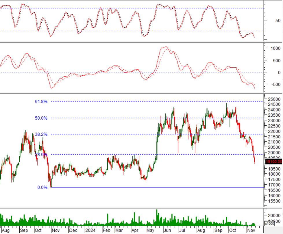 Hiện tại, giá cổ phiếu tiếp tục giảm sau khi thất bại trong việc test lại ngưỡng Fibonacci Projection 23.6% (tương đương vùng 19,300-20,300) trong bối cảnh chỉ báo MACD đang không ngừng mở rộng khoảng cách với đường Signal sau khi cho tín hiệu bán trước đó cho thấy nhịp điều chỉnh có thể tiếp diễn trong các phiên tới.
