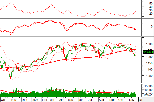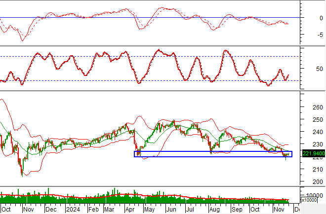 Hiện tại, HNX-Index đang test lại đáy cũ tháng 4/2024 (tương đương vùng 220-225 điểm) trong bối cảnh chỉ báo MACD tiếp tục thu hẹp khoảng cách với đường Signal sau khi cho tín hiệu bán trước đó. Nếu tín hiệu mua xuất hiện trở lại thì triển vọng ngắn hạn sẽ được cải thiện trong các phiên tới.