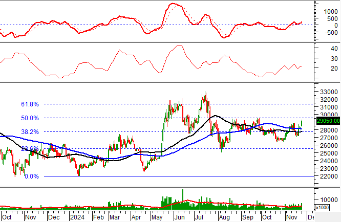 Hiện tại, giá cổ phiếu hướng đi lên test lại ngưỡng Fibonacci Projection 50% (tương đương vùng 28,800-29,800) trong bối cảnh chỉ báo MACD đang không ngừng mở rộng khoảng cách với đường Signal sau khi cho tín hiệu mua trước đó. Nếu giá cổ phiếu vượt thành công ngưỡng kháng cự này thì kịch bản phục hồi sẽ được củng cố thêm.
