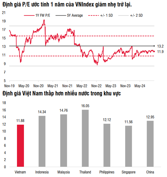 Thứ nhất, định giá ước tính một năm của VN-Index giảm nhẹ xuống còn 11.9 lần vào cuối tháng 10, từ mức 12.1 lần ở đầu tháng, cho thấy thị trường chịu áp lực giảm giá và chưa phản ánh nhiều chuyển biến tích cực của kết quả quý 3/2024.