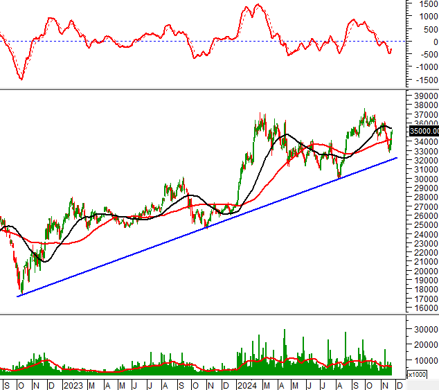 Hỗ trợ trong thời gian tới là trendline dài hạn (tương đương vùng 32,000-33,000).