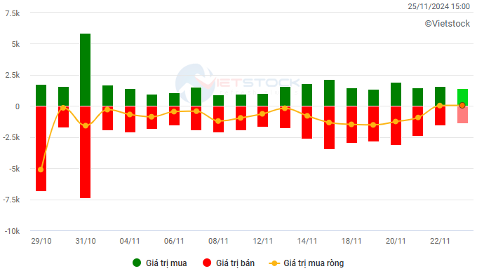 Biến động của dòng tiền từ khối ngoại: Khối ngoại tiếp tục mua ròng trong phiên giao dịch ngày 25/11/2024. Nếu nhà đầu tư nước ngoài duy trì hành động này trong những phiên tới thì tình hình sẽ càng lạc quan hơn.