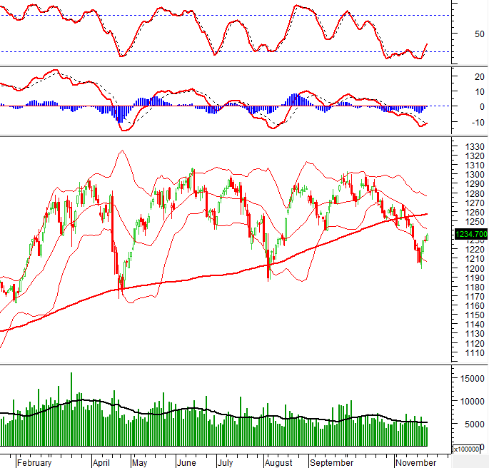 - Thị trường tiếp tục hồi phục với thanh khoản thấp trong phiên đầu tuần mới. Bắt đầu với diễn biến giằng co nhẹ trên mốc tham chiếu trong nửa đầu phiên sáng, lực cầu mặc dù không quá sôi nổi nhưng áp lực bán đã giảm đáng kể giúp sắc xanh được giữ vững đến hết phiên giao dịch. Bên cạnh đó, khối ngoại cũng có dấu hiệu chuyển biến tích cực khi tiếp tục giảm mạnh lực bán. Kết phiên, VN-Index đóng cửa với mức tăng 6.6 điểm, đạt 1,234.7 điểm.