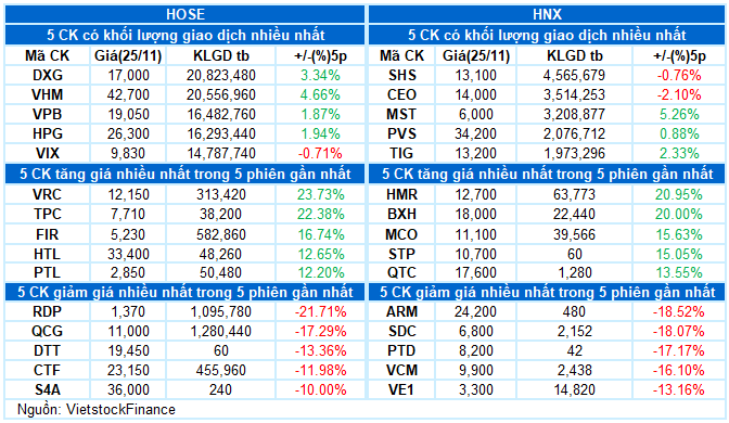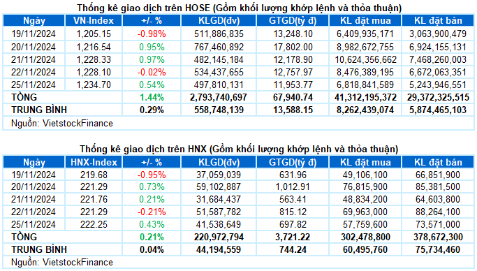 - Các chỉ số chính tăng điểm trong phiên giao dịch 25/11. VN-Index kết phiên tăng 0.54%, lên mức 1,234.7 điểm; HNX-Index dừng tại mốc 222.25 điểm, tăng 0.43% so với phiên trước.