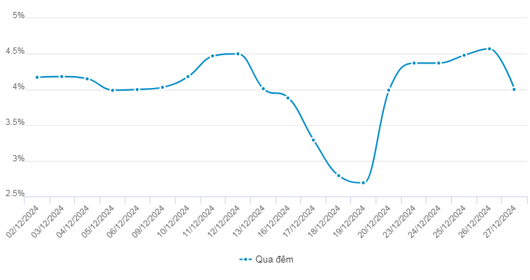 Mặt bằng lãi suất liên ngân hàng kỳ hạn qua đêm xoay quanh 4.37-4.57%/năm trong những ngày đầu tuần (23-26/12) và giảm về mức 4%/năm vào cuối tuần (27/12) khi nhà điều hành tiếp tục giữ cố định lãi suất OMO ở mốc 4%/năm.