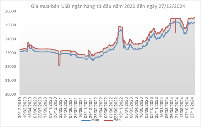 Sau động thái bán USD can thiệp của NHNN (từ ngày 18/12), tỷ giá USD/VND tại Vietcombank quay đầu giảm nhẹ về còn 25,208-25,538 đồng/USD (mua vào - bán ra) vào cuối ngày 27/12, nằm trong biên độ giao dịch cho phép.