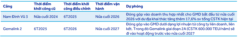 Hai dự án Nam Đình Vũ 3 và Gemalink 2 lần lượt cũng sẽ được triển khai giúp CSTK của GMD tăng thêm 2.1 triệu TEU/năm (tăng 60% so với CSTK hiện tại). Đối với cảng Gemalink 1, việc hoạt động vượt CSTK trong năm nay là điều kiện quan trọng trong quá trình hoàn tất thủ tục hồ sơ pháp lý, giấy phép xây dựng, và các thủ tục thu xếp vốn. Trong khi đó, cảng Nam Đình Vũ 3 hiện đang được triển khai nạo vét và san lấp mặt bằng. Diễn biến của 2 dự án này có phần chậm hơn so với dự phóng lần đầu, CTCK này điều chỉnh lại như sau: