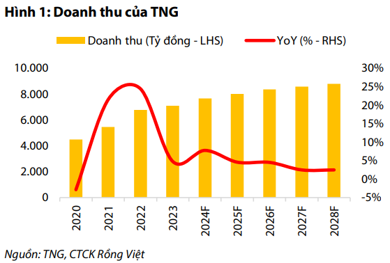 CTCK Rồng Việt (VDSC) dự phóng doanh thu của CTCP Đầu tư và Thương mại TNG (HNX: TNG) sẽ đạt 7.650 tỷ vào năm 2024 đồng (tăng 8% so với năm trước) và 8,800 tỷ đồng vào năm 2028, tương ứng với tốc độ tăng trưởng kép là 4%. Ngoài gia công, TNG hiện đang cho thuê đất tại cụm công nghiệp Sơn Cẩm 1, doanh thu lĩnh vực này đóng góp không đáng kể nhưng lại mang tới dòng tiền ổn định cho Công ty. Mặt khác, TNG sẽ tạm dừng kinh doanh lĩnh vực thời trang thương hiệu và không còn đóng góp vào kết quả kinh doanh trong giai đoạn 2024–2028.