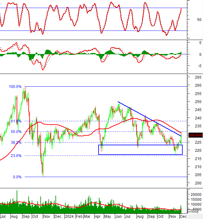 Tuy nhiên, chỉ số đã phá vỡ thành công cạnh trên (tương đương vùng 229-232 điểm) của mẫu hình Descending Triangle trong khi chỉ báo MACD đã cắt lên trên mức 0 sau khi cho tín hiệu mua. Nếu nhịp phục hồi ngắn hạn được duy trì thì mục tiêu giá (Price target) tiềm năng trong trung hạn của HNX-Index sẽ là vùng 258-261 điểm.