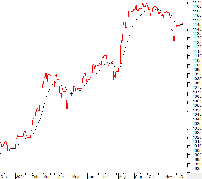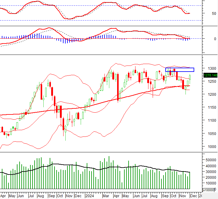 Trong khung thời gian tuần (02-06/12/2024), VN-Index tiếp nối đà tăng với 3 tuần tăng điểm liên tiếp đồng thời có cơ hội test lại đỉnh cũ tháng 10/2024 (tương đương vùng 1,285-1,300 điểm). Ngoài ra, khối lượng giao dịch cần vượt lên trên mức trung bình 20 tuần để đà tăng được củng cố.