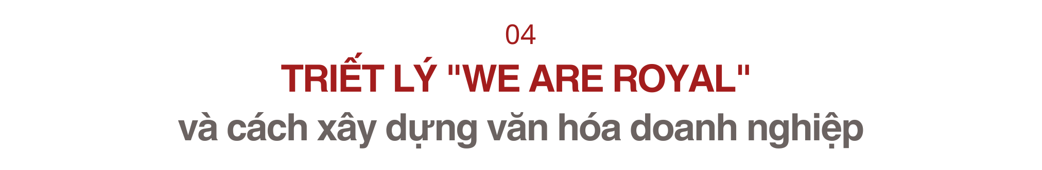 - Các bạn có thể thấy qua hệ thống tôn chỉ của Royal, một trong những giá trị cốt lõi mà tôi luôn nhấn mạnh chính là "We are Royal" - "Chúng ta là Royal". Đây không những là khẩu hiệu mà còn là nền tảng xây dựng một tập thể gắn kết, hướng đến một mục tiêu chung - sự phát triển bền vững của Royal. Mỗi cá nhân trong đội ngũ làm việc vì lợi ích cá nhân để cùng xây dựng sự nghiệp chung của doanh nghiệp. Đó là niềm tự hào, là động lực cho tất cả cùng phấn đấu, cống hiến vì Royal.