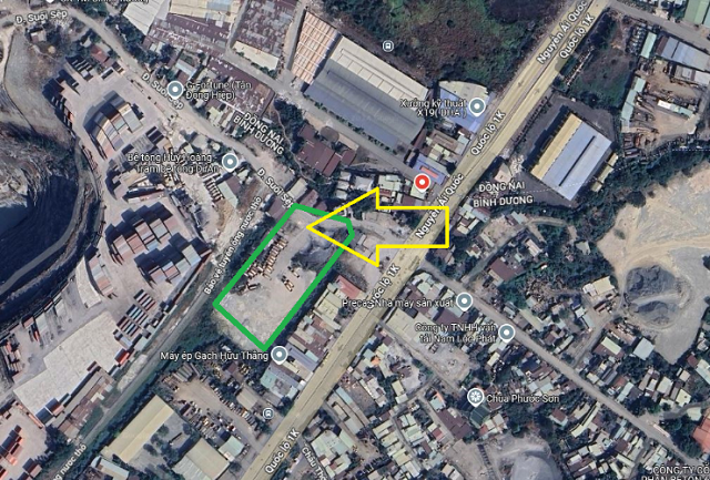 Phần đất SH Đông An thế chấp ngân hàng theo mũi tên màu vàng. Khu đất xây dự án The An 1.4ha nằm trong viền màu xanh lá. Nguồn: Thông tin quy hoạch Bình Dương