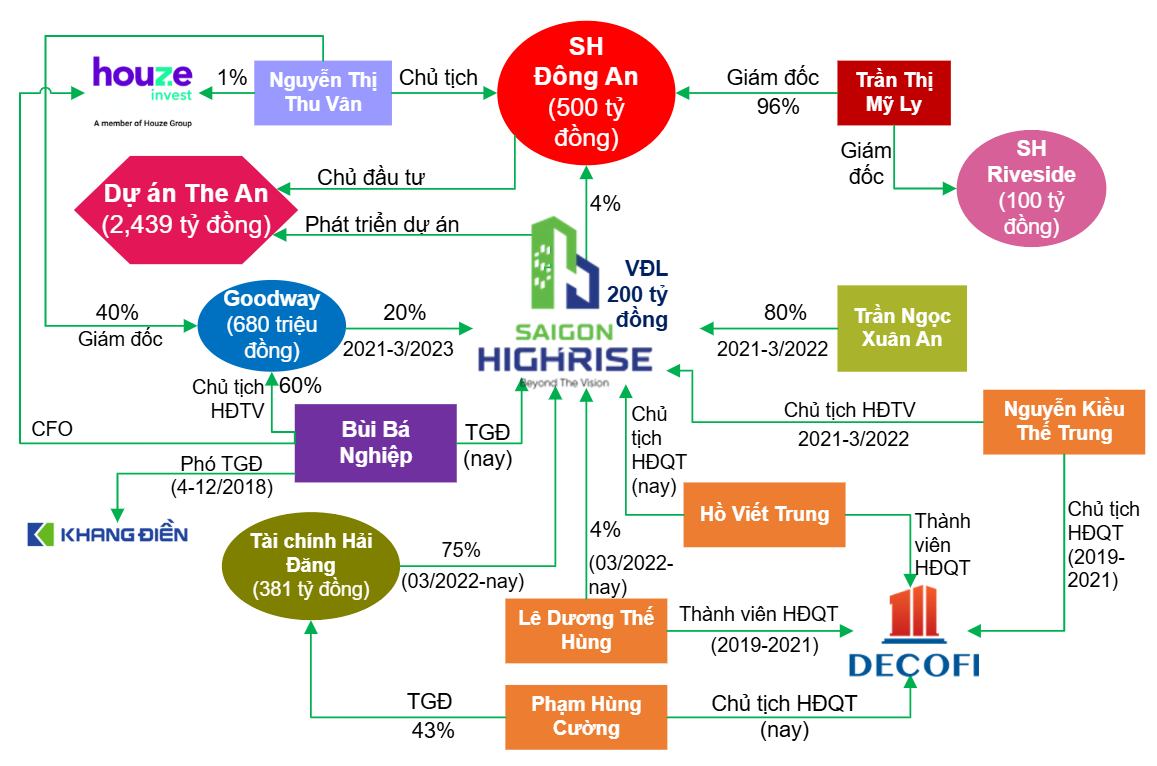 Đáng chú ý, các cổ đông của Đầu tư Sài Gòn High Rise hầu hết có mối liên hệ với CTCP Xây dựng và Thiết kế Số 1 (Decofi, UPCoM: DCF). Trong đó, ông Nguyễn Kiều Thế Trung làm Chủ tịch HĐQT DCF nhiệm kỳ 2019-2024, sau đó vào tháng 4/2021, ông từ nhiệm vì lý do cá nhân. Tương tự, ông Lê Dương Thế Hùng cũng là Thành viên HĐQT DCF nhiệm kỳ 2019-2024, từ nhiệm vào tháng 4/2021 với lý do cá nhân. Ông Hồ Viết Trung hiện là Thành viên HĐQT độc lập DCF, được bổ nhiệm vào tháng 4/2023.