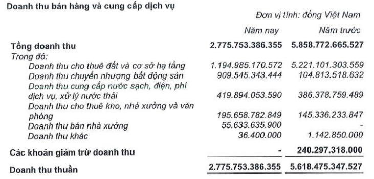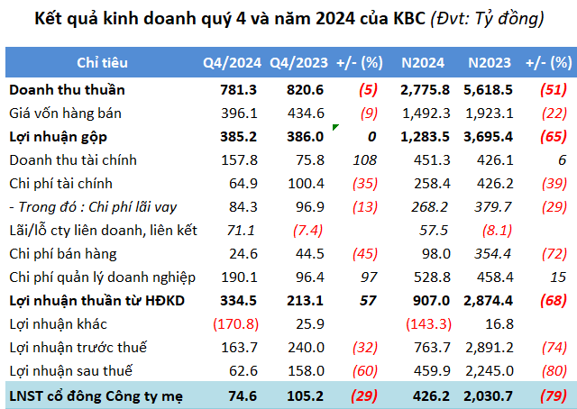 Năm 2024, KBC có kết quả kinh doanh kém sắc hơn năm trước khi cả doanh thu gần 2,776 tỷ đồng và lãi ròng hơn 426 tỷ đồng đều giảm lần lượt 51% và 79%, do doanh thu cho thuê đất và cơ sở hạ tầng khu công nghiệp (KCN) giảm mạnh 77% về còn gần 1,195 tỷ đồng.