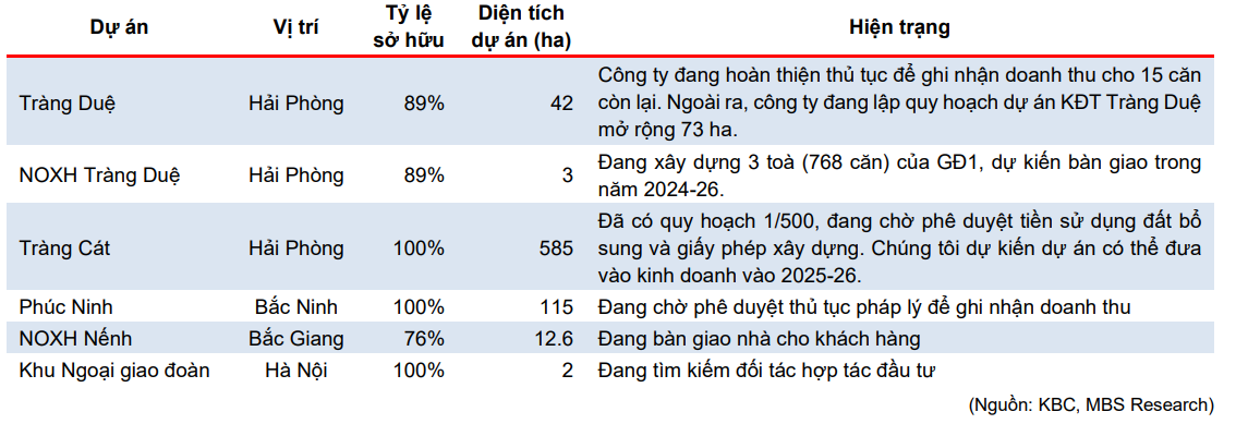 Hiện KBC đang có 6 dự án bất động sản đang được triển khai. Đáng chú ý nhất là dự án khu công nghiệp và khu đô thị Tràng Cát (Hải Phòng) có diện tích quy hoạch 585ha, diện tích thương phẩm là 282ha, tổng mức đầu tư hạ tầng hơn 11,329 tỷ đồng, đã được bàn giao đất, được chấp thuận san lấp mặt bằng, đã đền bù 582ha.