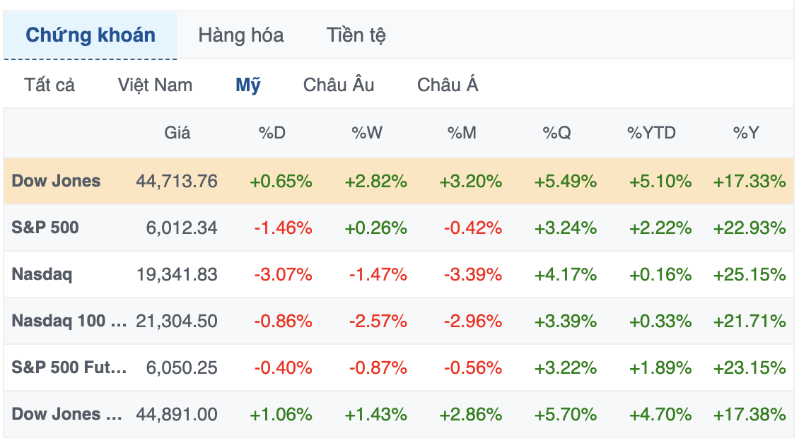 Kết thúc phiên giao dịch ngày 27/01, chỉ số Nasdaq Composite rớt 3.07% xuống 19,341.83 điểm, chỉ số S&P 500 mất 1.46% còn 6,012.28 điểm. Chỉ số Dow Jones lùi 289.33 điểm (tương đương 0.65%) xuống 44,713.58 điểm. Đà tăng của cổ phiếu Apple, Johnson & Johnson và Travelers đã giúp hỗ trợ chỉ số Dow Jones.