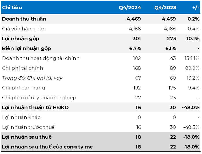 Tuy nhiên, áp lực từ chi phí đã khiến lợi nhuận sụt giảm mạnh. Chi phí bán hàng tăng hơn 9% lên 192 tỷ đồng do sản lượng tiêu thụ tăng và giá cước vận chuyển leo thang. Đáng chú ý, chi phí tài chính tăng vọt 90% lên 168 tỷ đồng, chủ yếu do chi phí lãi vay tăng và ảnh hưởng từ biến động tỷ giá. Kết quả là lợi nhuận sau thuế quý 4 chỉ đạt 18.4 tỷ đồng, giảm 18% so với cùng kỳ.
