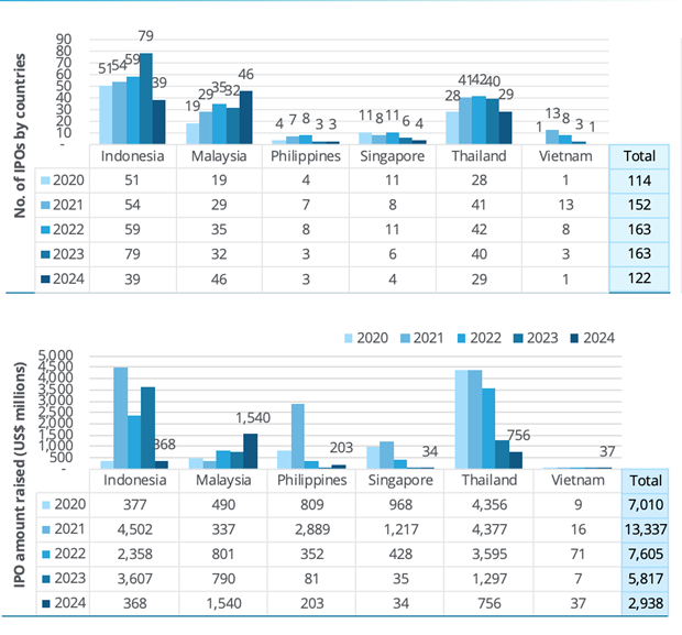 Riêng tại khu vực Đông Nam Á, thị trường IPO đã chạm đáy 9 năm với chỉ 122 thương vụ, huy động được 3 tỷ USD, giảm mạnh so với 163 thương vụ và 5.8 tỷ USD của năm 2023.