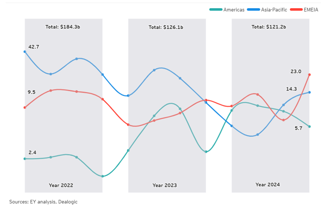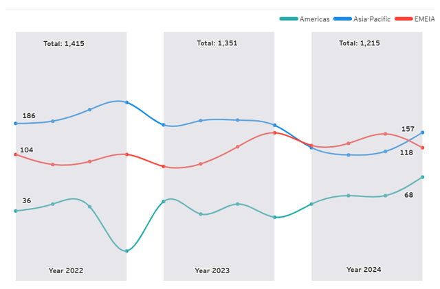 Ngược lại, khu vực châu Á-Thái Bình Dương tiếp tục xu hướng giảm từ năm 2021, chỉ còn 35% và giá trị giảm 51% so với năm trước.