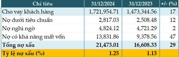 Tổng nợ xấu của VietinBank tính đến 31/12/2024 là 21,473 tỷ đồng, tăng 29% so với đầu năm. Tỷ lệ nợ xấu/dư nợ tăng nhẹ từ mức 1.13% đầu năm lên 1.25%.