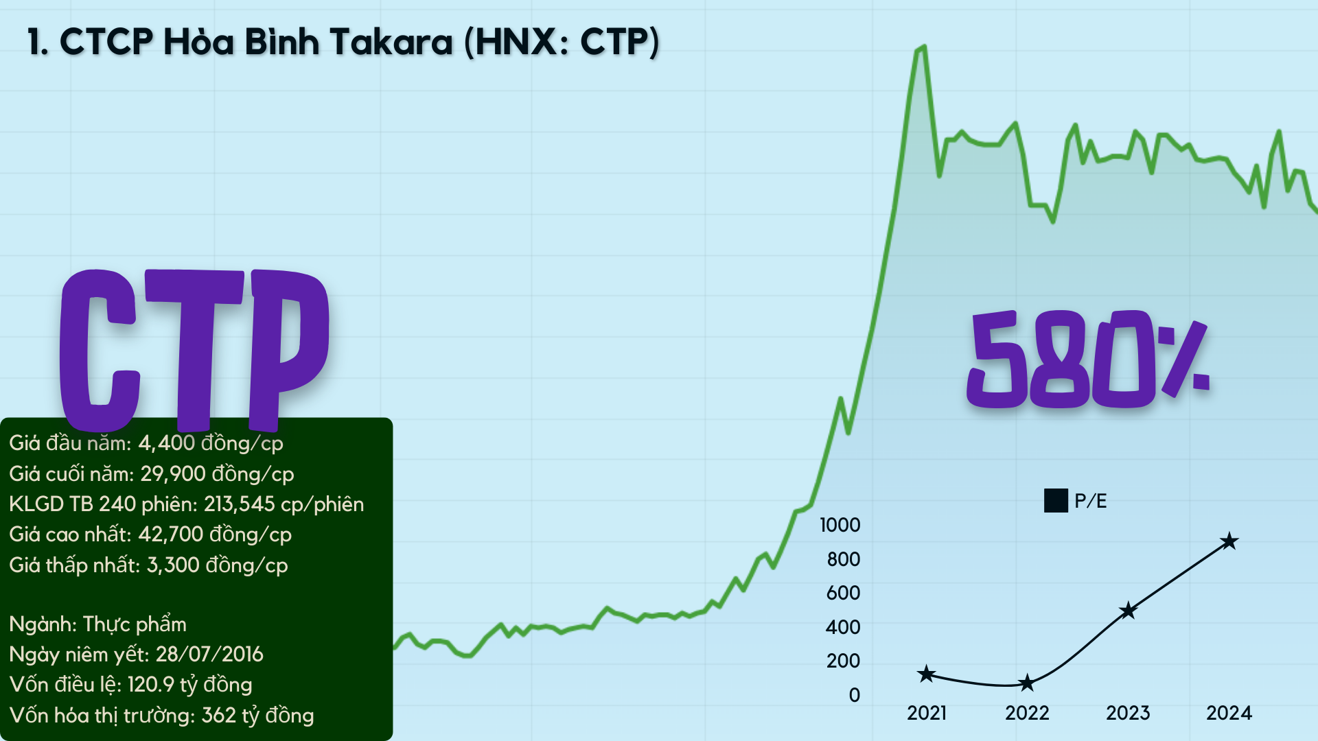Tăng mạnh nhất là CTP với mức tăng "khủng" 580% trong năm qua. Cổ phiếu này có lúc tăng hơn 870%, lên gần 44,000 đồng/cp nhưng đã điều chỉnh khá nhiều. Doanh nghiệp từng đổi tên 2 lần trong 5 năm qua đang chuyển dần trọng tâm hoạt động sang mảng bất động sản. |