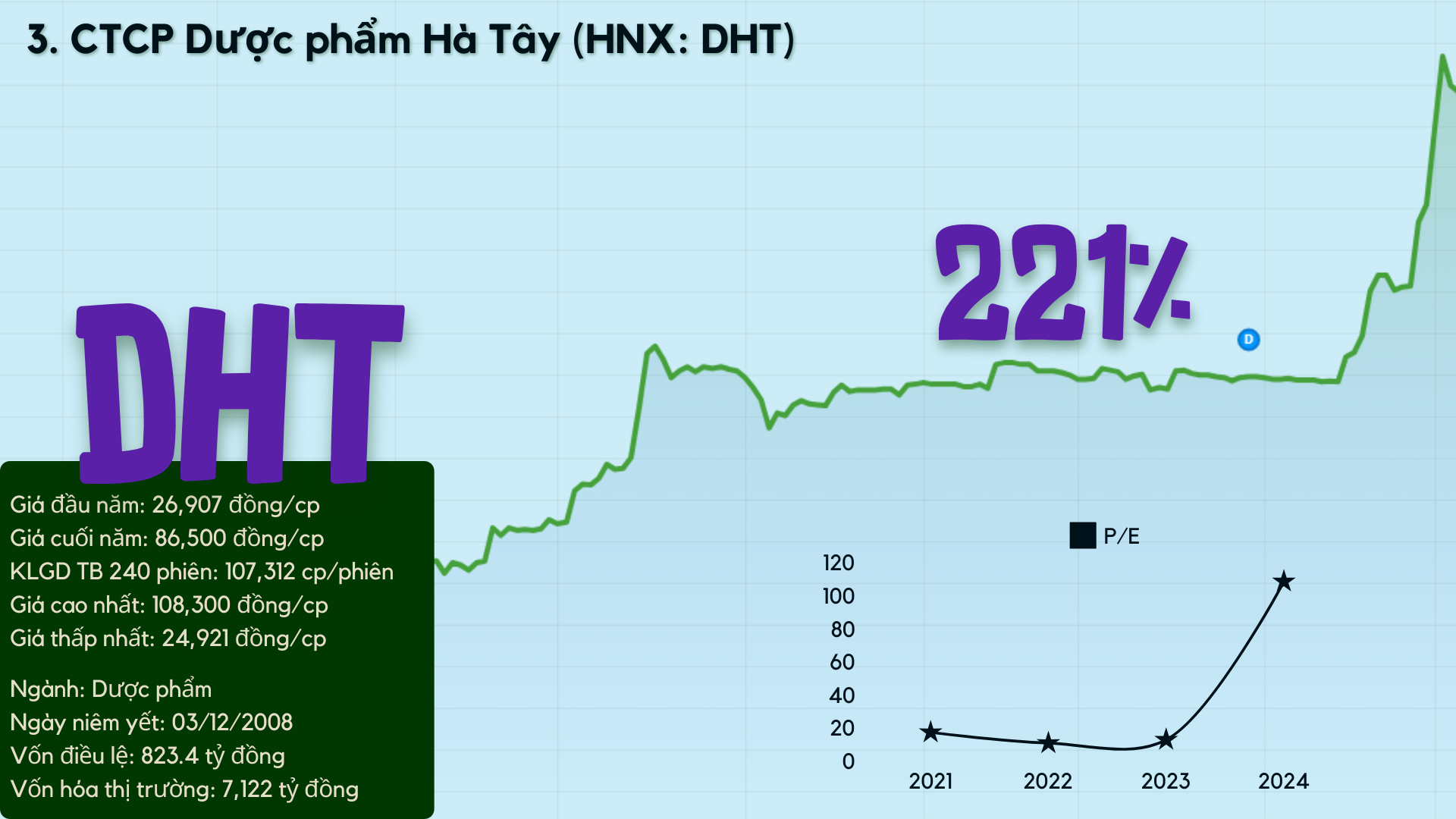 DHT - doanh nghiệp dược phẩm hiếm hoi tăng mạnh trong năm qua, ghi nhận 221%. Một trong những thông tin khiến giá cổ phiếu tăng đáng kể là hãng dược Nhật Bản ASKA Pharmaceutical liên tiếp tăng sở hữu cổ phần của DHT. |