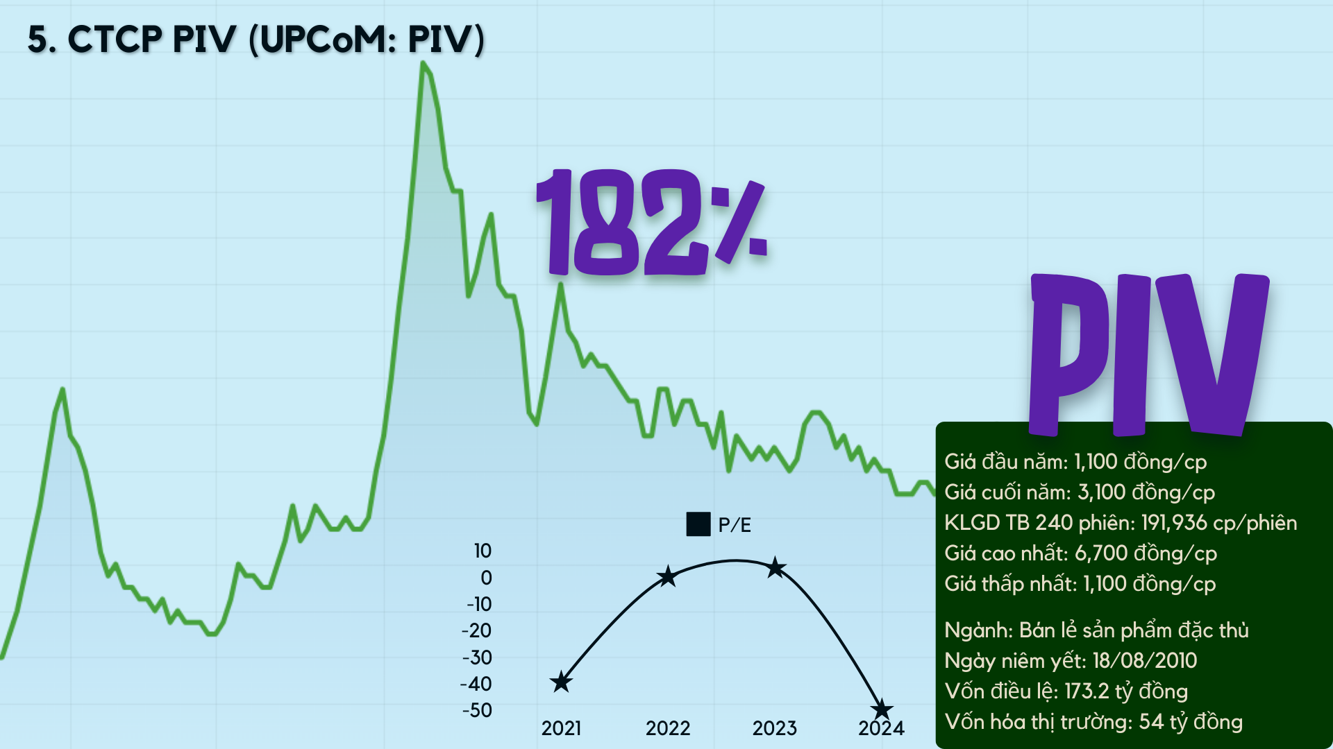 Trong khi đó, giá cổ phiếu PIV đột ngột tăng vọt chỉ trong 8 phiên đầu tháng 6, bao gồm 7 phiên kịch trần liên tiếp nhưng doanh nghiệp này nói "do cung cầu của thị trường". Giá thậm chí có thời điểm gấp hơn 5 lần so với đầu năm nhưng sau đó giảm dần, kết năm tăng 182%. PIV chỉ vừa mới chuyển sang kinh doanh, thương mại mô tô, xe máy và xe đạp hồi năm 2023. |