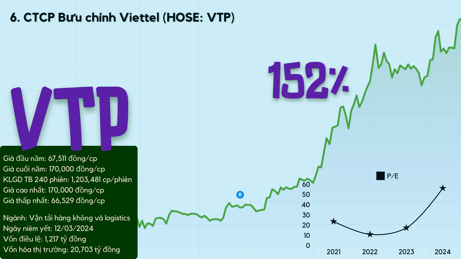 PHP cũng là doanh nghiệp cảng biển hiếm hoi trong top 10. Giá cổ phiếu này liên tục đi lên trong suốt cả năm với mức tăng 134%. Điểm sáng đáng kể có lẽ là kỷ lục lợi nhuận đạt được vào quý 3, cao nhất từ trước đến nay và nhiều khả năng khép lại cả năm 2024 với đỉnh cao mới. |