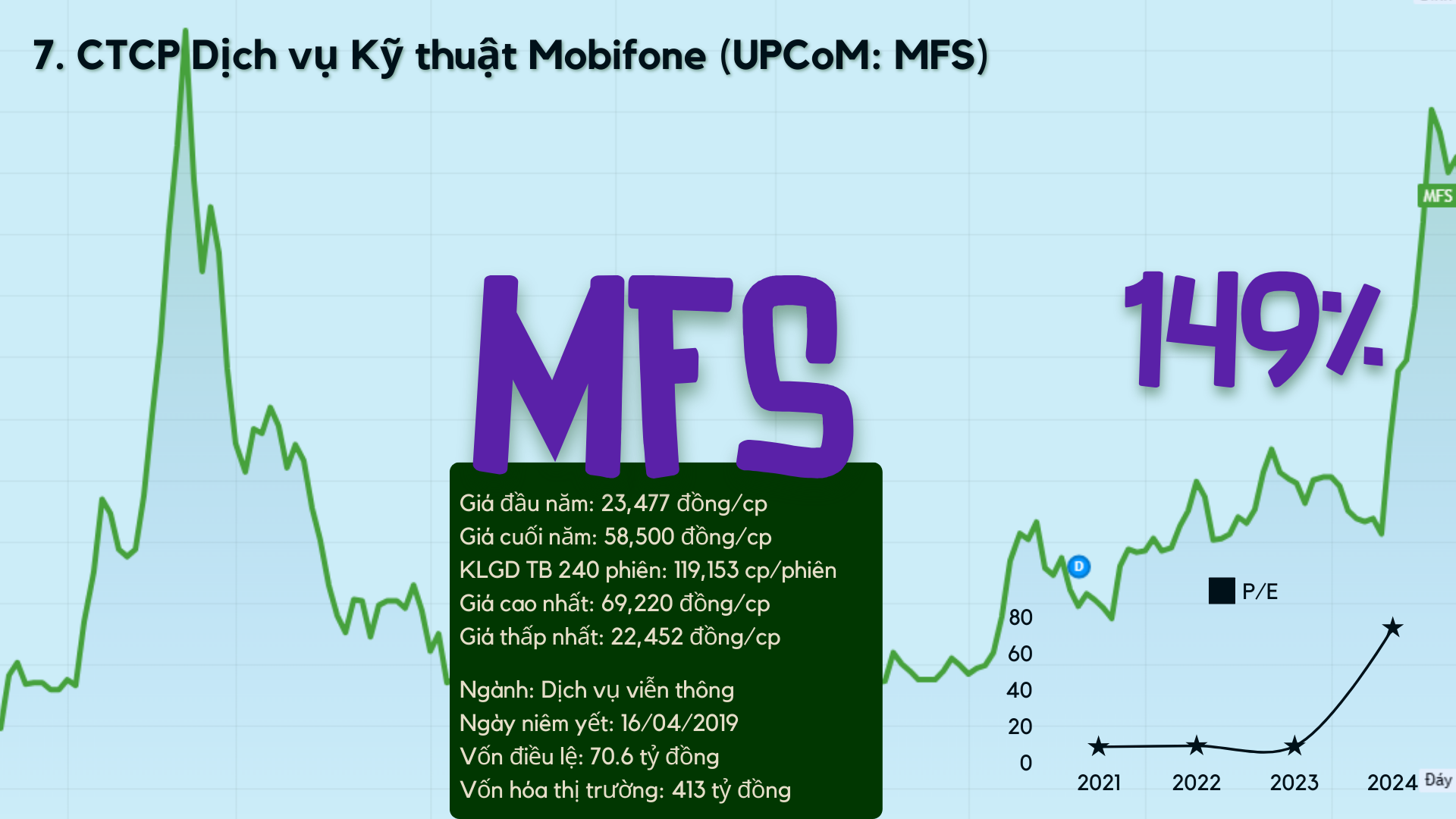 MFS tiếp tục là cổ phiếu ngành viễn thông có diễn biến tăng mạnh và bất thường trong năm Giáp Thìn. Cổ phiếu "họ" Mobifone này tạo mô hình "cây thông" khi từng tăng sốc 193% từ vùng 25,000 đồng/cp cuối tháng 5 lên đỉnh lịch sử 74,300 đồng/cp phiên 21/06, nhưng ngay sau đó bay sạch thành quả trong tháng 7. Bên cạnh sự tích cực của ngành, thông tin đáng kể duy nhất khi đó có lẽ là mức cổ tức 2,500 đồng/cp. |