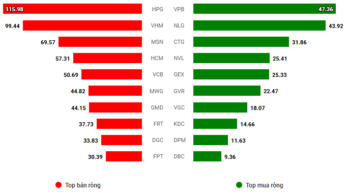 Giá trị giao dịch ròng theo mã cổ phiếu. Đvt: Tỷ đồng